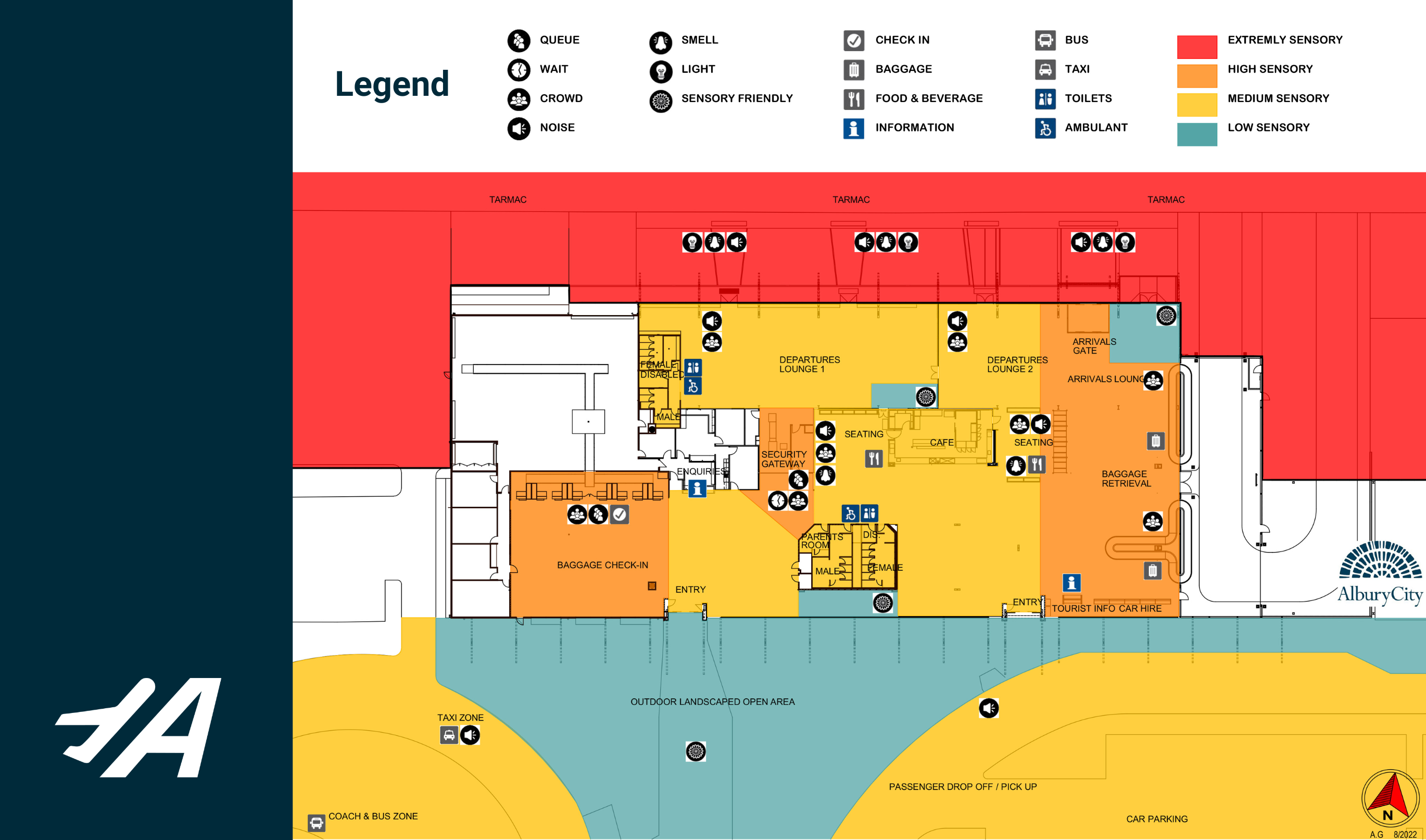 Helping to navigate your way through our terminal, we've developed a sensory map that identifies low, medium and high sensory areas. This map helps those with hidden disabilities, and sensitivities prepare for crowded areas, additional noise, smells and lights - and also identifies quieter sensory-friendly (green) areas.