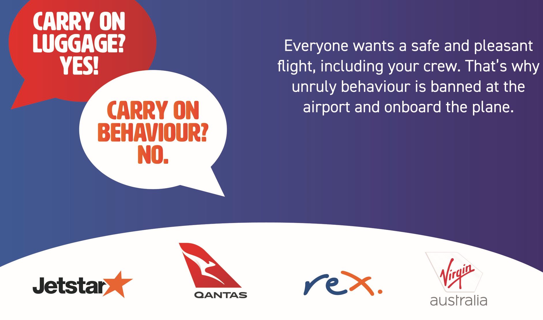 Airports and airlines across the country will support the joint campaign ‘No More Carry On’ which plays on the concept that while carry-on luggage is allowed, disruptive or abusive ‘carry-on behaviour’ will not be tolerated.